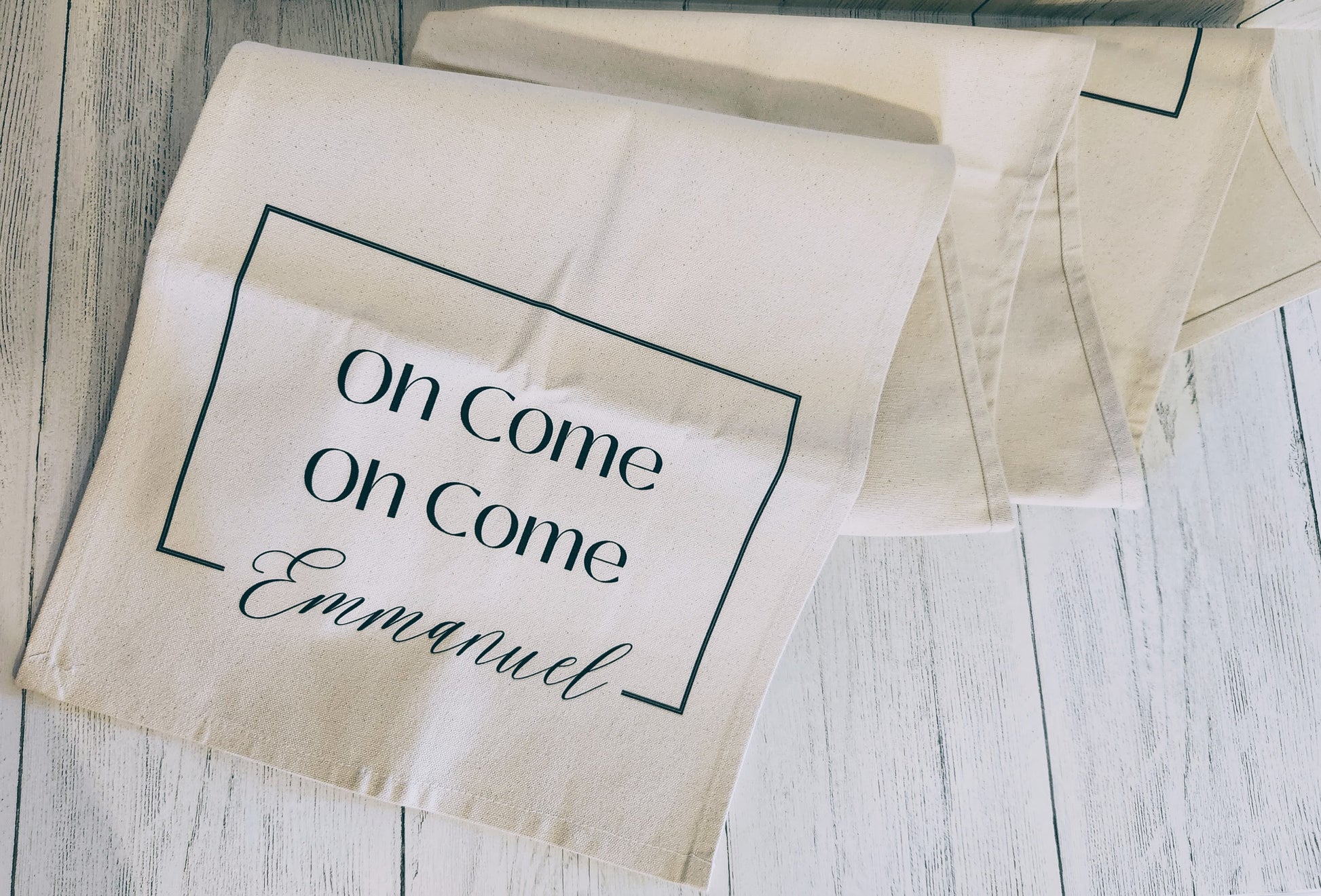 - Table Runner: These Emmanuel table runners were sourced from "cotton and Canvas Company" and designed by our very own Ellie Mae. They were a breeze to work with and have several other canvas related home decor items you can check out. $22